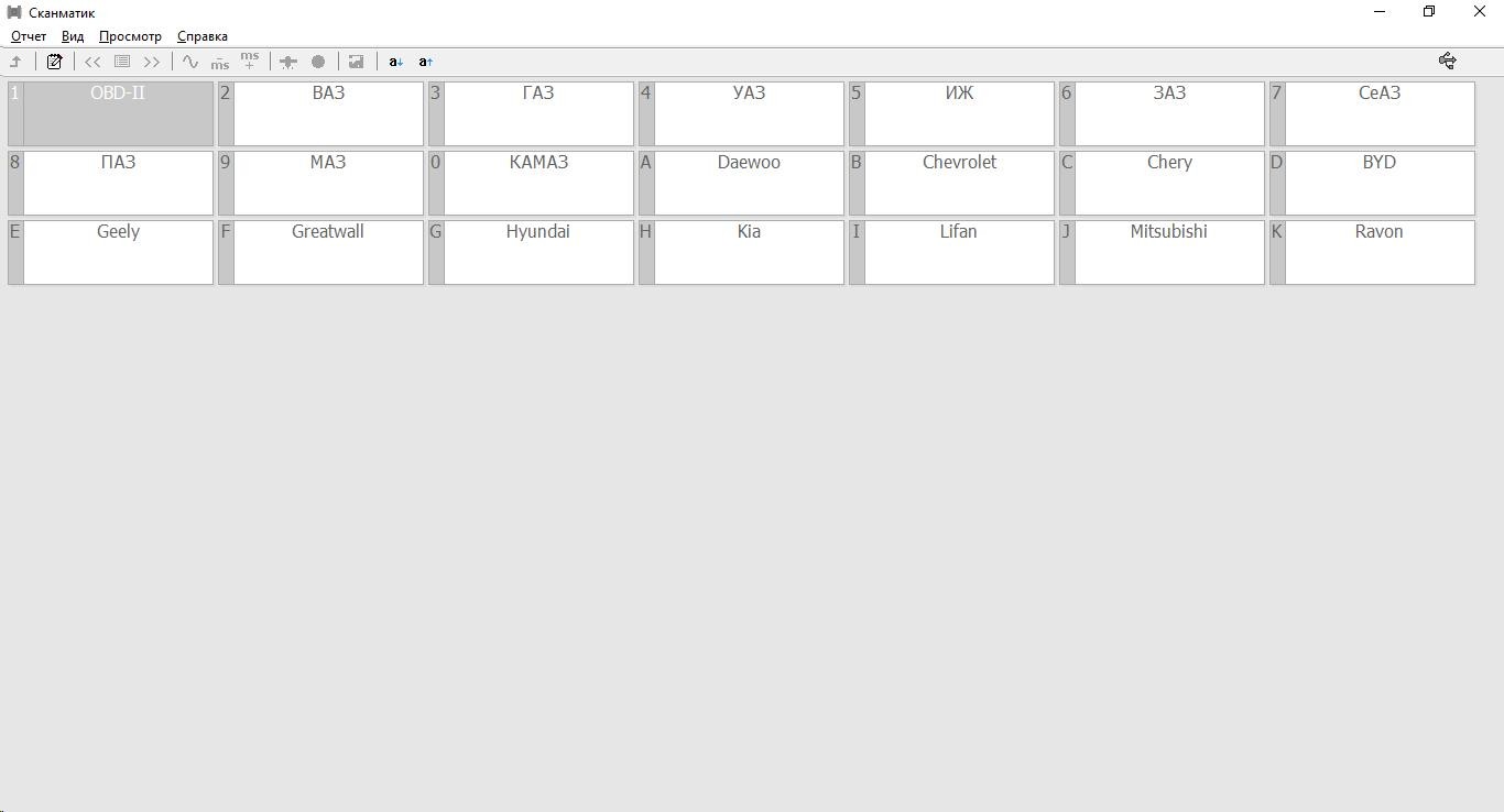 В программе доступны для диагностики OBD-II, ВАЗ, ГАЗ, УАЗ, ИЖ, ЗАЗ, СеАЗ, ПАЗ, МАЗ, КАМАЗ, Daewoo, Chevrolet, Chery, BYD, Geely, Greatwall, Hyundai, Kia, Lifan, Mitsubishi, Ravon.